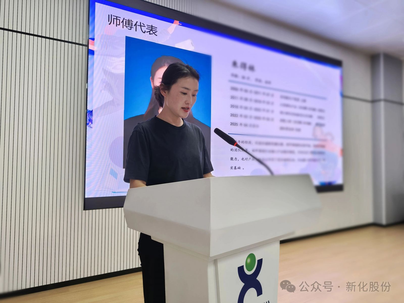 授旗仪式后,“薪火相传”环节接续登场,成为传承九州网匠心的生动载体。师傅代表、公司资深业务骨干朱得林同志结合自身在九州网19 年的成长历程,分享了从职场新人到“技术能手”的奋斗故事。“薪火不是简单的技能传递,而是‘把事情做到极致’的信念接力。”她笑着对新员工说,“期待你们接过这根‘接力棒’,在岗位上打磨真本领,让青春在实干中闪光。”